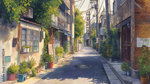 © umeno, Fototapeta premium 細い通りが続く住宅街の路地裏を描いた水彩風景イラスト、建物と植物が並ぶ生活感ある街並み、昭和レトロ、懐かしい日常、散歩道の空気感を表現、動画制作や広告ビジュアルに使える背景素材