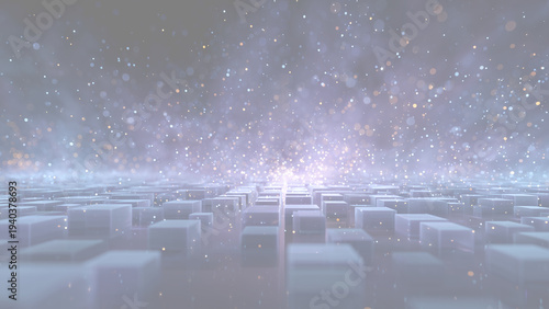 © Wasabi, Obraz premium 青い地平線から差し込む光と手前に並ぶデジタル立方体の影