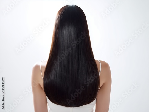 Obraz premium 艶やかなキューティクルが光る美しく整えられた黒髪ロングヘアの女性の後ろ姿