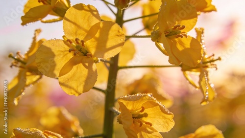 Fototapeta premium 노란 야생화가 따뜻한 햇빛 속에서 부드럽게 피어 있는