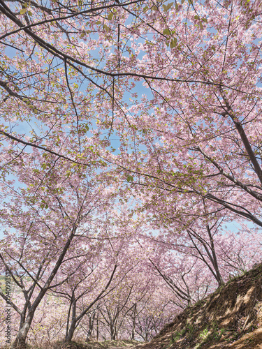 Obraz premium 春風そよぐ桜の丘。満開の河津桜と青空