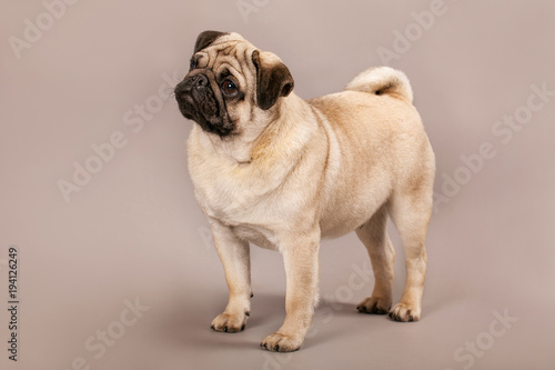 Obraz premium Мопс стоит на изолированном фоне в студии.