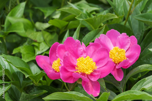 © Kazutaka, Fototapeta premium 庭園に鮮やかに咲くピンクの芍薬(シャクヤク)の花と瑞々しい緑の葉