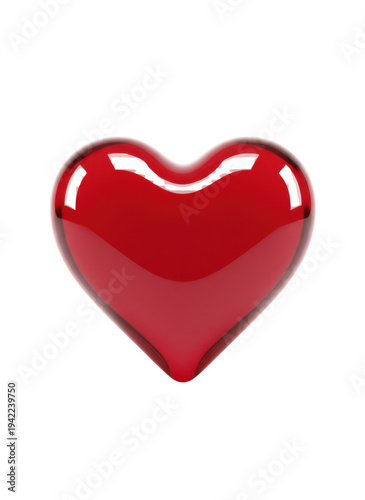 Fototapeta premium 透明感のある光沢が美しい、立体的な赤いガラスのハートが白背景に浮かぶ、愛と情熱を象徴するロマンチックなイメージ
