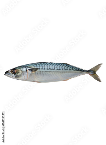 Obraz premium 白い背景に横たわる新鮮なサバ一匹のクローズアップ。銀色の腹と青緑色の背中に特徴的な縞模様が見える。魚介類の食材や健康的な食事のコンセプトに最適なストックフォト。