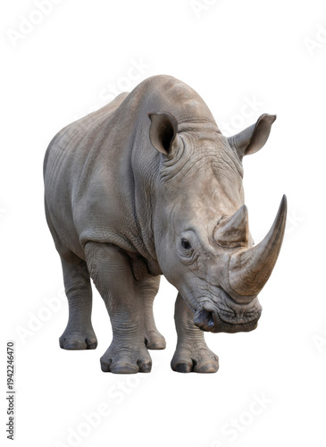 Fototapeta premium 白い背景に立つサイの全身像。力強く、堂々とした姿が特徴で、野生動物の力強さと美しさを表現しています。動物園、自然保護、教育関連のデザイン素材に最適です。