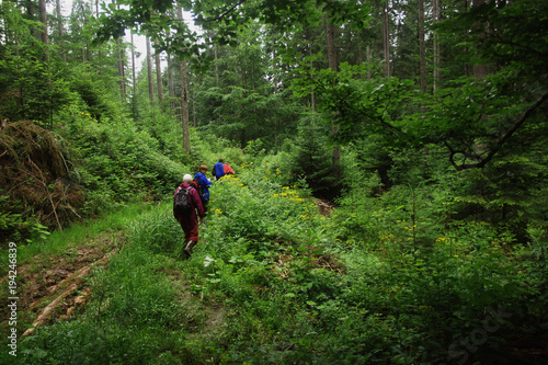 © Лидия Куценко, Fototapeta premium Туристы в лиственном лесу