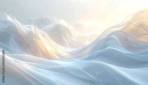 © LuckyStride, Fototapeta premium 右上から暖光が射す半透明シルクウェーブの白灰色山岳背景