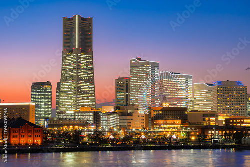 Obraz premium 神奈川県横浜市 ブルーアワーの空と煌めく街明かりが美しいみなとみらいの夜景