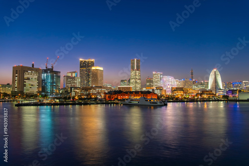 Fototapeta premium 神奈川県横浜市 ブルーアワーの空と煌めく街明かりが美しいみなとみらいの夜景