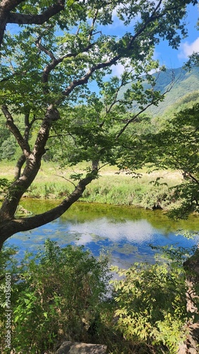 © ZaeA, Obraz premium 맑은 하늘과 구름, 산과 강을 따라 걷는 데크 둘레길의 여름 풍경