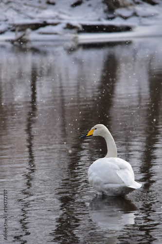 Obraz premium 吹雪の川に立つ一羽の白鳥