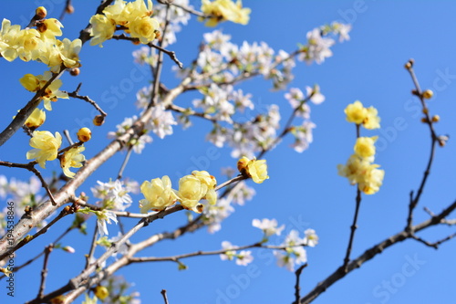 Obraz premium 満開のロウバイと桜、背景イメージ素材