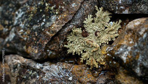 Obraz premium 石垣の暮らしの生態、乾いた地衣類が雨で緑に戻る呼吸の記録