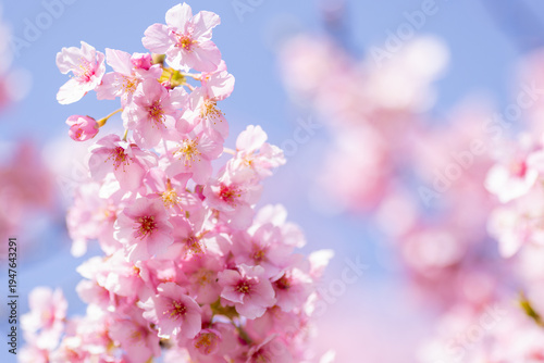 Fototapeta premium 青空に映える満開の河津桜と柔らかな光の玉ボケ