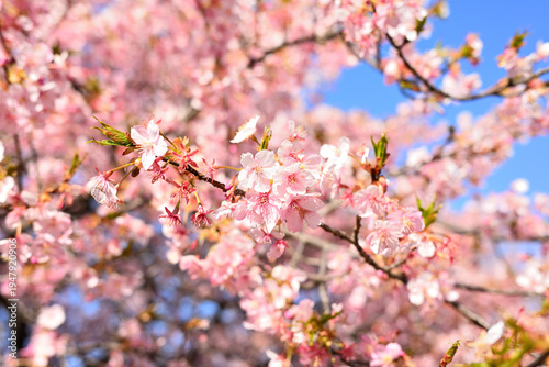 © kajizuka_y, Obraz premium 榛の森公園(深谷市)の河津桜 満開から散りゆくピンクの花びらと青空の風景