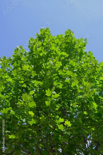 Obraz premium 初夏の朝の新緑のユリノキと青空