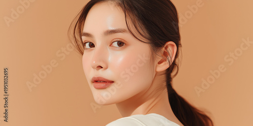 Obraz premium 美容, 女性, スキンケア, 化粧品, ビューティー, 若い女性, 美肌, 日本人, アジア人, フェイシャル, メイク, 美容液, 保湿, クリーム, エイジングケア, 美容医療, エステ, 美容クリニック, 肌ケア, ナチュラルメイク, 透明感, ツヤ肌, モデル, 笑顔, ポートレート, クローズアップ, リラックス, 癒し, 健康的, 美白, コラーゲン, ヒアルロン酸, アンチエイジング