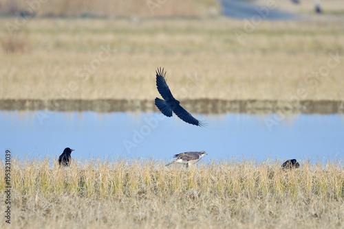 Fototapeta premium ハシブトガラスにモビングされるオオタカ(鹿児島県・出水市)
