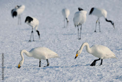 Fototapeta premium オオハクチョウとタンチョウ(北海道・鶴居村)