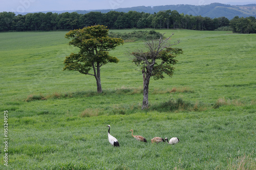 © 愛 高行, Fototapeta premium 牧草地を歩くタンチョウの家族(北海道・鶴居村)