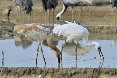 © 愛 高行, Fototapeta premium 餌を食べるソデグロヅルの成鳥と幼鳥(鹿児島県・出水市)