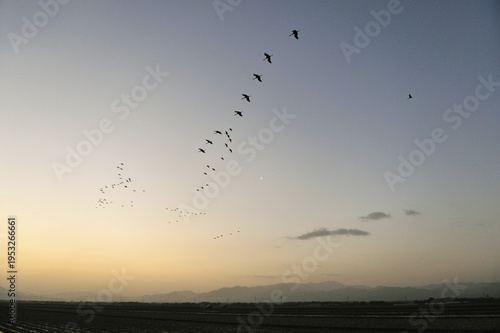 © 愛 高行, Fototapeta premium 隊列を組んで飛翔するツルの群(鹿児島県・出水市)