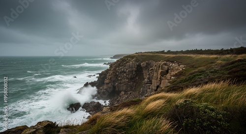 Obraz premium 重厚な曇り空の下 荒れる海が断崖に力強く打ち寄せる劇的な海岸風景 波飛沫が舞い上がる瞬間
