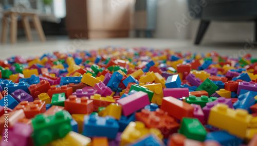 © bephoto, Obraz premium リビングの床に広がるビビッドなレゴブロック散乱の硬質なカオス