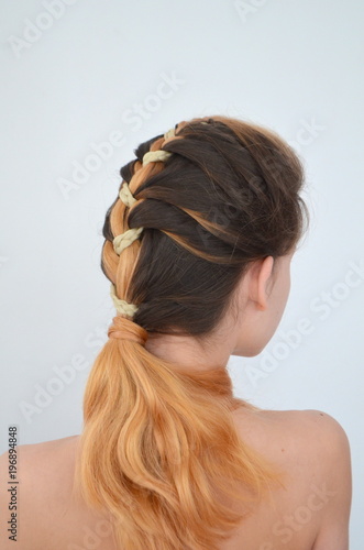 © yuliyam, Naklejka premium Девочка-подросток с современными косами, волос канекалон натурального цвета. Молодая девушка