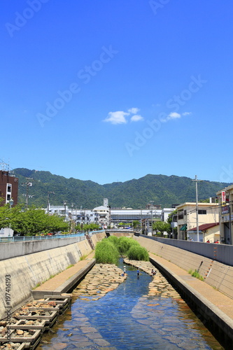 Obraz premium 初夏の河川敷で水遊びをする親子、神戸市灘区都賀川にて