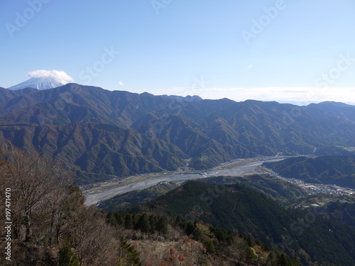 Fototapeta premium 身延山からの富士山と富士川。身延 山梨 日本。11月中旬。