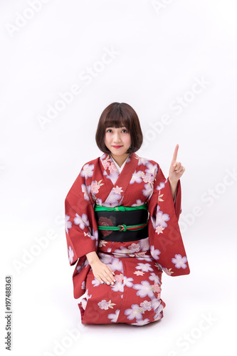 Fototapeta premium 着物 大和撫子 白背景 正座 指差し