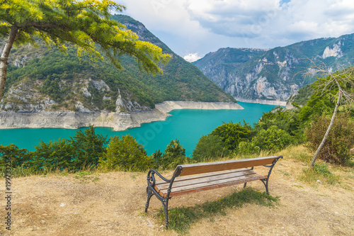 © lufotolab, Obraz premium Скамейка на фоне красивого озера Пивское в горах Черногории