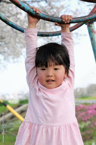 © apple713, Fototapeta premium 桜の下で遊具で遊ぶ女の子