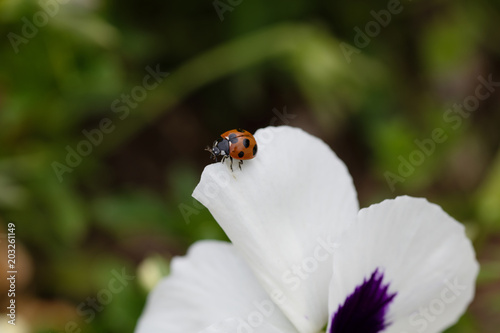 © mr, Naklejka premium 白いパンジーとてんとう虫