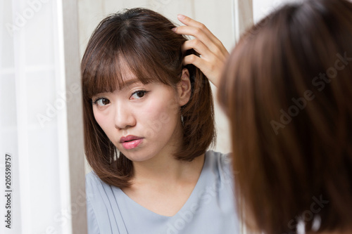 Fototapeta premium 鏡・髪を触る女性