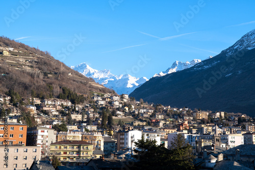 Obraz premium 春の朝のアオスタの風景(イタリア ヴァッレ・ダオスタ州)