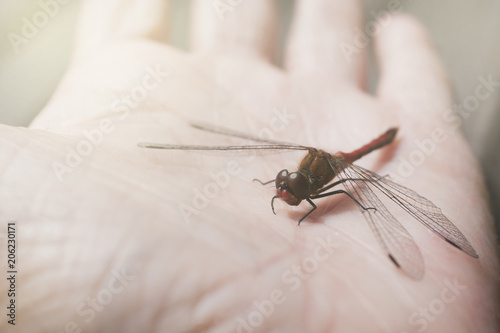 © yulanaom, Obraz premium небольшая стрекоза на ладони