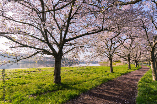 © masahiro, Obraz premium 快晴の朝に平筒沼に咲く桜並木