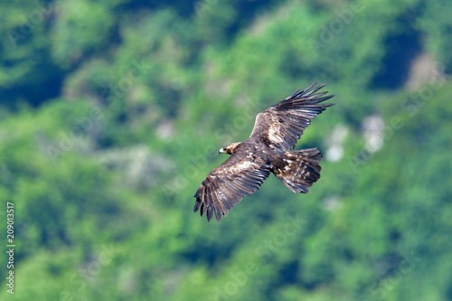 Obraz premium 新緑バックに威風堂々と飛ぶイヌワシ