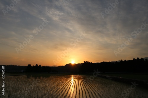 © nonsan, Obraz premium 夜明けの田園風景/富山の田舎の夜明けの田園風景