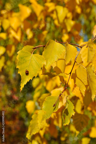 © jaroslav36, Fototapeta premium Листья березы осенью пожелтели.