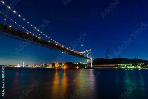 Obraz premium 夜の関門海峡。橋にかかる月と金星