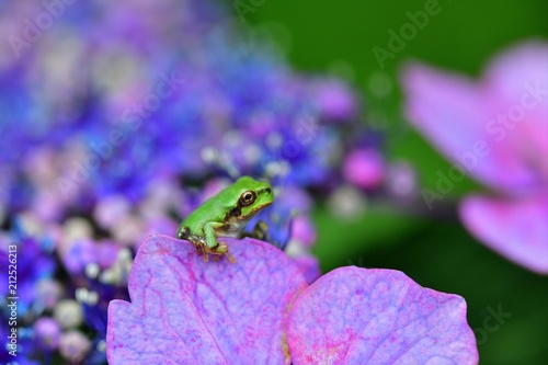 Obraz premium 紫陽花の花びらに片肘ついてくつろぐアマガエル