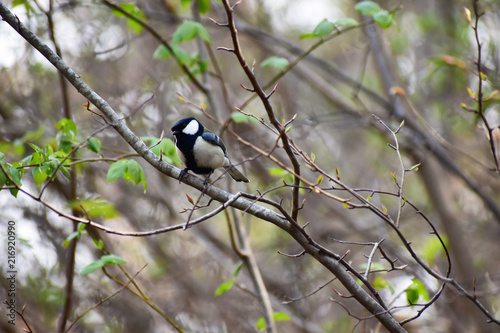 Naklejka premium 早春の暗い森のシジュウカラ