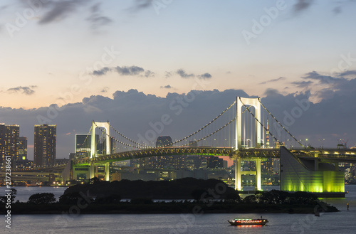 Obraz premium 夕暮れのお台場と明かりのともったレインボーブリッジ