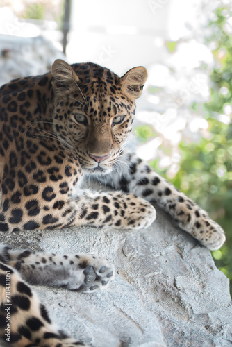 Obraz premium アムールヒョウが悠々と休んでいる。ヒョウ柄が美しいアップ