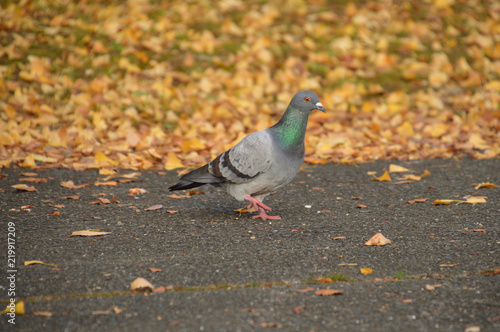 Obraz premium 黄色く色づいた落ち葉を背景にした1羽のハト