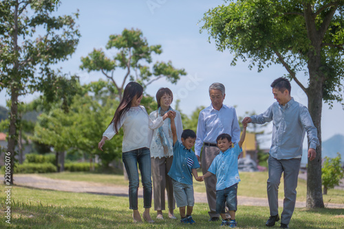 Obraz premium 手を繋いで公園を歩く三世代家族